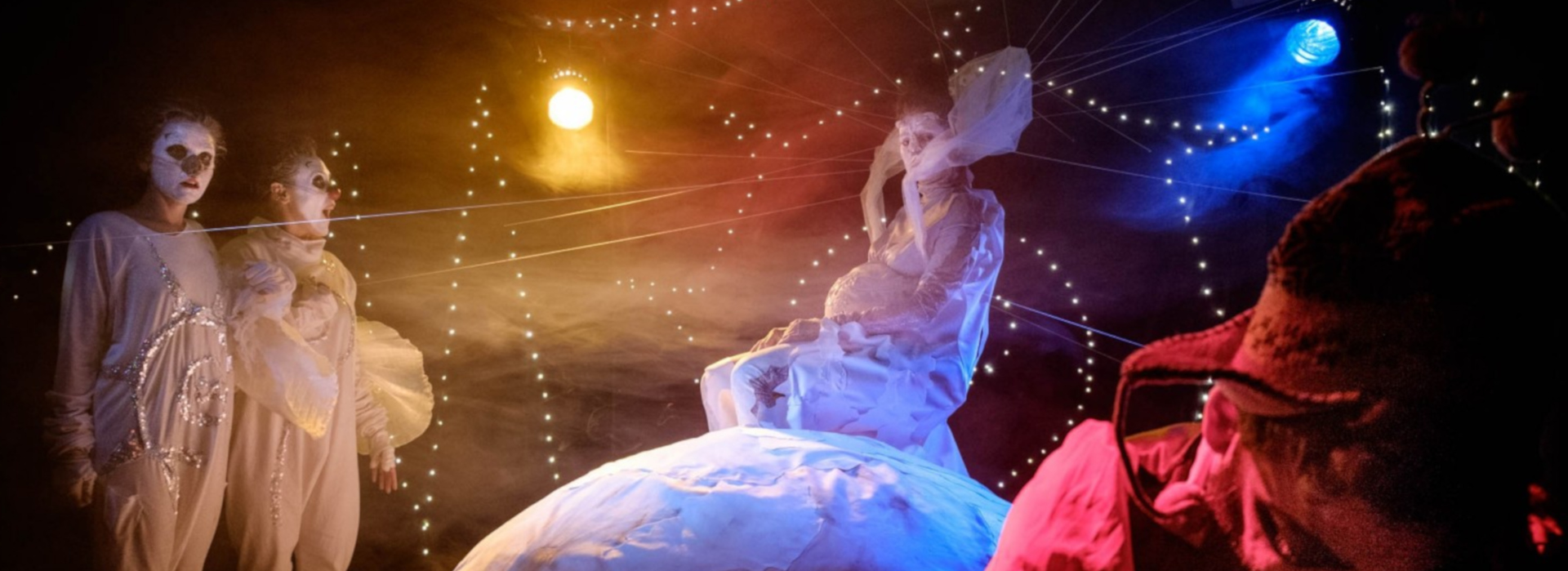 “Pour la scénographie autour de cette lune, on a créé un ciel étoilé. Remplaçant enfin les tissus dépareillés du garage par 30 mètres de draps noirs ornés de 50 mètres de loupiotes led. On a aussi emprunté à L’Opéra de Bordeaux une vieille machine à fumée et construit avec Bastien un refroidisseur pour produire une fumée épaisse et lourde sur les plans et conseils avisés de Peter Schuler."