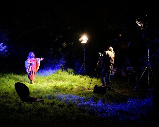 “Pour que notre ‘Théâtre du Garage’ aille de paire avec cette scénographie ambitieuse, et pour réussir la photo de Yéroelle, nous avons aussi ajouté un lino noir au sol, isolé de la lumière le chapiteau où se trouvent les spectateurs, posé de la moquette au sol, refait de nouveaux bancs…Un nouveau théâtre pour un nouveau décor s’est alors mis en place."